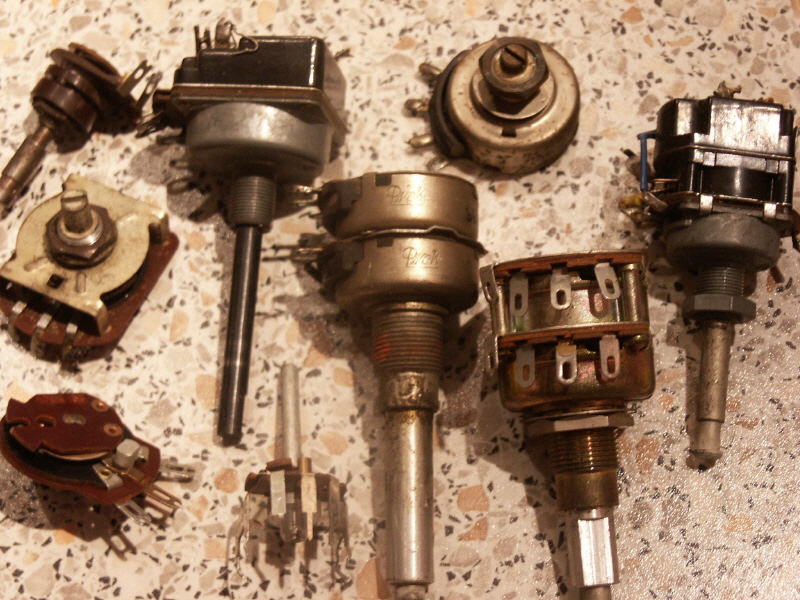 Ein ernsthaftes Problem in der Ersatzteilbeschaffung stellen die Potentiometer dar. Die aberwitzigsten Variationen wurden hier in 70 Jahren eingebaut. Die Forderung, sich von der Konkurenz abzusetzen, hat hier sehr deutliche Spuren hinterlassen. 3-D-Ton, gehörgerechte Lautstärkeregelung und -tonhöhenregelung/absenkung u.s.w, haben eine derartige Typenvielfalt hinterlassen, dass selbst eine gut ausgerüstete Werkstatt dieser Ersatzteilbeschaffung nicht nachkommen kann. Die üblichen Hausmittelchen, Kontaktspray und "Reinigung" der Kontaktbahnen (soweit bei mehrstufigen Potis überhaupt möglich) zeigen meist nur kurze "Heilungserfolge". Selbst "neue" (sind ja dann auch Jahrzehnte alt) Ersatztypen zeigen nicht immer die erwünschten Erfolge. Ich habe in meiner Sammlung mehrere Hunderte von Potentiometern an Lager, es wird hier wohl noch einige Monate bis zur vollständigen Web-Präsenz dauern. Ein kurzes Beispiel: 1x 3,3MOhm linear (Ebene 1), 1x 2,5MOhm log (Ebene 2), 1x 2,7 MOhm lin mit 2 Abzapfungen (Ebene 3), 1x Zugschalter(2-pol) und 1 Drehschalter (2-pol) auf geteilter Achse.