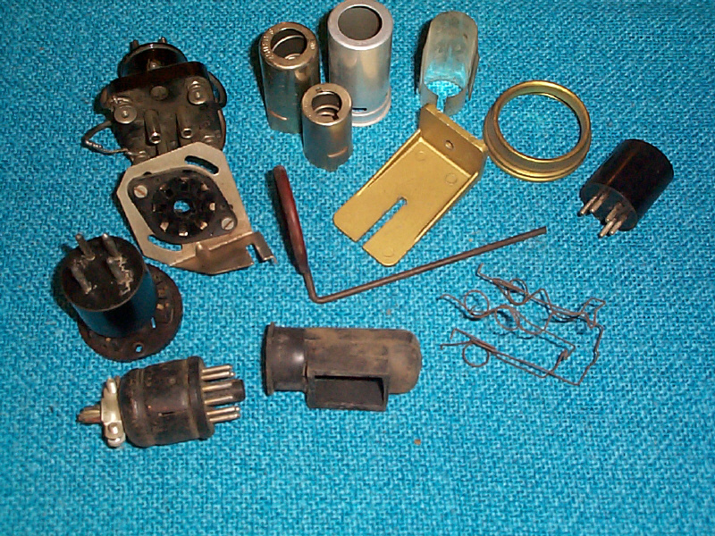Verschiedene Zubehörteile.. von vorne links: Ein Steckverbinder für Duodekal-Fassungen, eine Gummihaube für Abstimmanzeigenröhren (EM87..), Drahtbügel für Noval-Röhren, Fassungsadapter von Stahlröhren- auf Europafassung, Befestigungswinkel mit Oktal-Fassung, Haltebügel für A-Röhren, Montagewinkel für Abstimmröhren (EM4...), Steckverbinder (unbek. Fassung- ich suche noch..), Fassungsadapter Europa-/Europafassung (auf eine andere Pin-Belegung) mit Uralt-Europafassung (Aufbau-Fassung), verschiedene Röhren-Abschirmbecher, Befestigungsring für Stahlröhren und einen Abschirmbecher für Abstimmanzeigen ((EM8...).